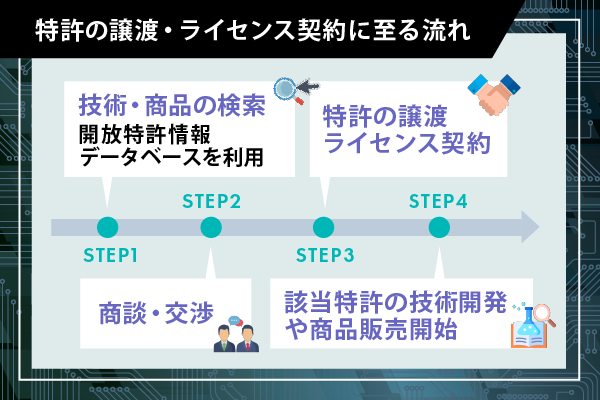 データベースの検索から譲渡やライセンス契約につながるまでの流れは、以下のとおりです。