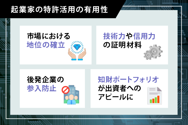起業家の事業展開における特許の有用性について、以下の4つの視点で解説します。