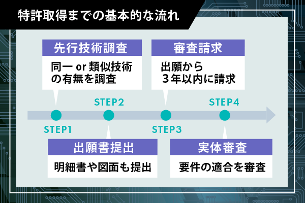 特許取得までの基本的な流れについて、以下の4段階で紹介します。